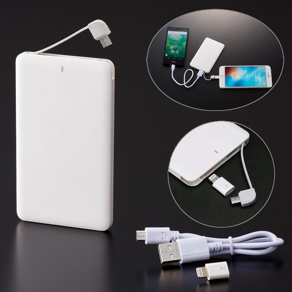 2台同時に充電することも可能なコード付きのモバイル充電器。androidもiPhoneも利用可能!スリムでカバンやポケットに入れて持ち歩けます。クロネコシロネコのオリジナルデザイン入りです(写真は未デザインのものです)!